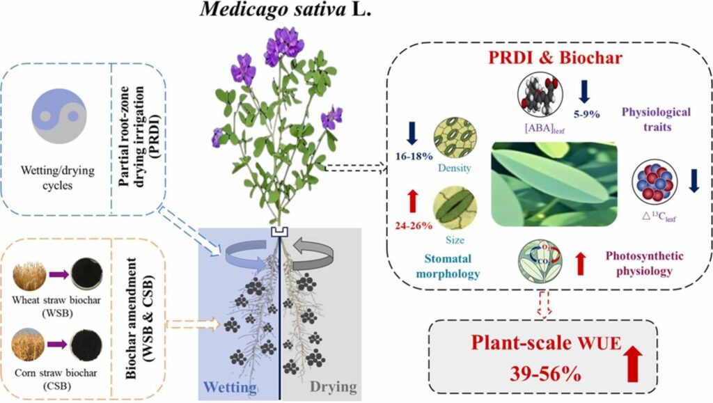 The research investigated how combining biochar, a porous, carbon-rich soil amendment material produced through pyrolysis, with various deficit irrigation regimes impacts alfalfa (Medicago sativa L.), a crucial forage crop often constrained by water scarcity and salinity in arid and semi-arid regions.