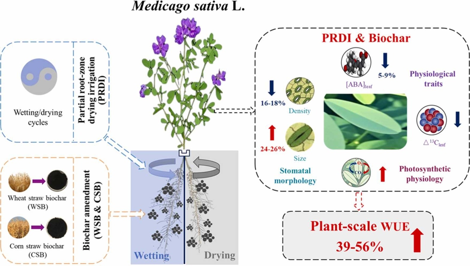 The biochar application also optimized leaf stomatal traits, leading to enhanced leaf intrinsic water use efficiency and long-term water use efficiency (indicated by lower carbon isotope discrimination). Biochar improved the overall plant water status, leading to higher rates of net CO2 assimilation and ultimately promoting plant growth and total biomass. For instance, under PRDI treatment, biochar increased total biomass by 42% to 56% compared to the control without biochar. This demonstrates that the biochar-PRDI combination mitigates the typical trade-off, achieving high water use efficiency while sustaining greater productivity.